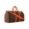 • The Keepall Bandouliere 50 travel bag is made from Monogram Macassar canvas with colored-leather top handles, lateral bands, and name tag.