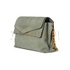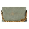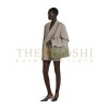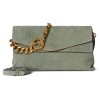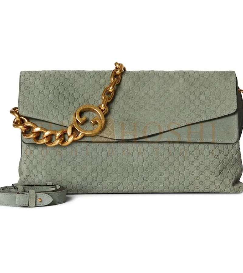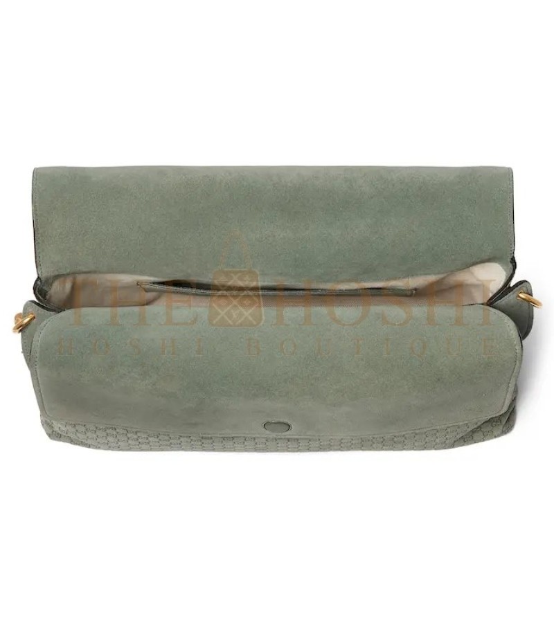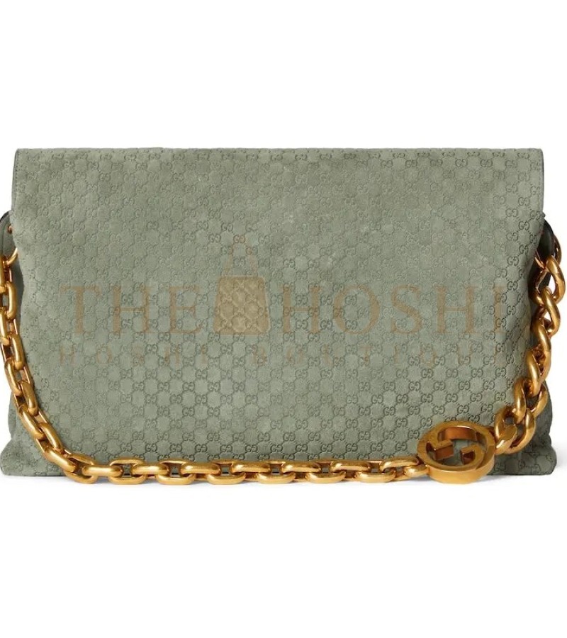 Green suede with GG embossing, antique gold-tone hardware, brown cotton-linen blend lining